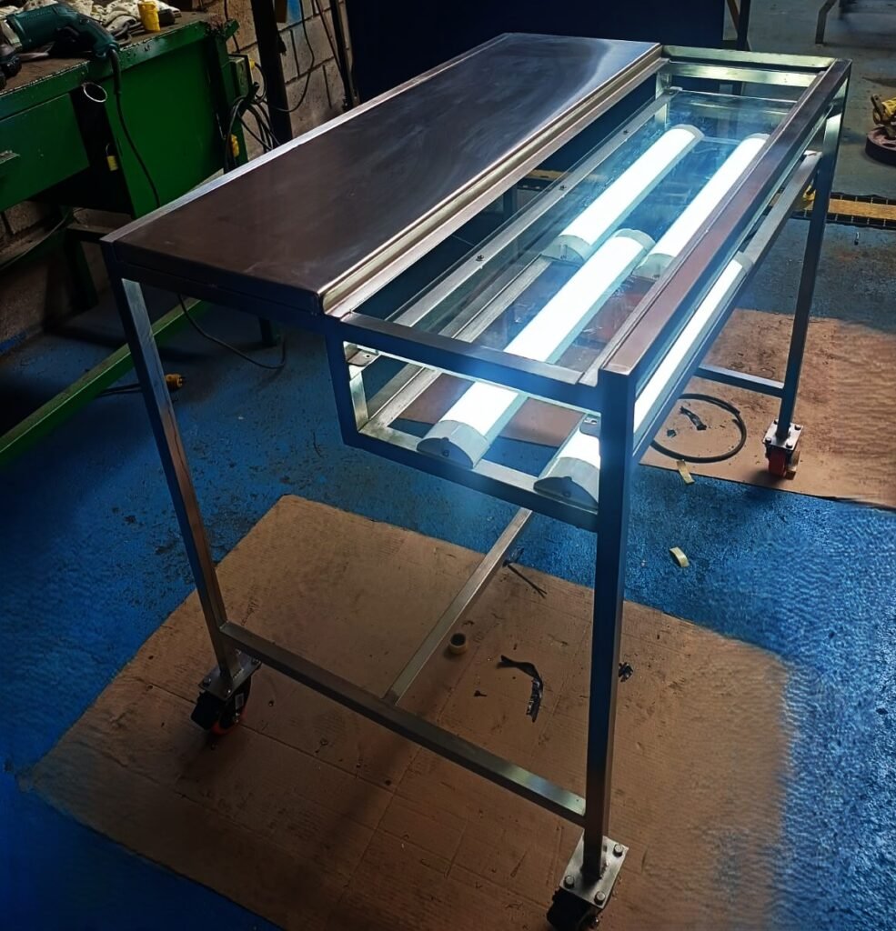 Diseñamos y fabricamos montaje con luces fluorescentes para la idenetificación de embriones de huevos, para garantizar que los huevos son aptos para el consumo manteniendo la calidad del producto final y la experiencia de los consumidores. El montaje se realizó a medida con ruedas para su fácil transporte y disposición dentro de la planta.